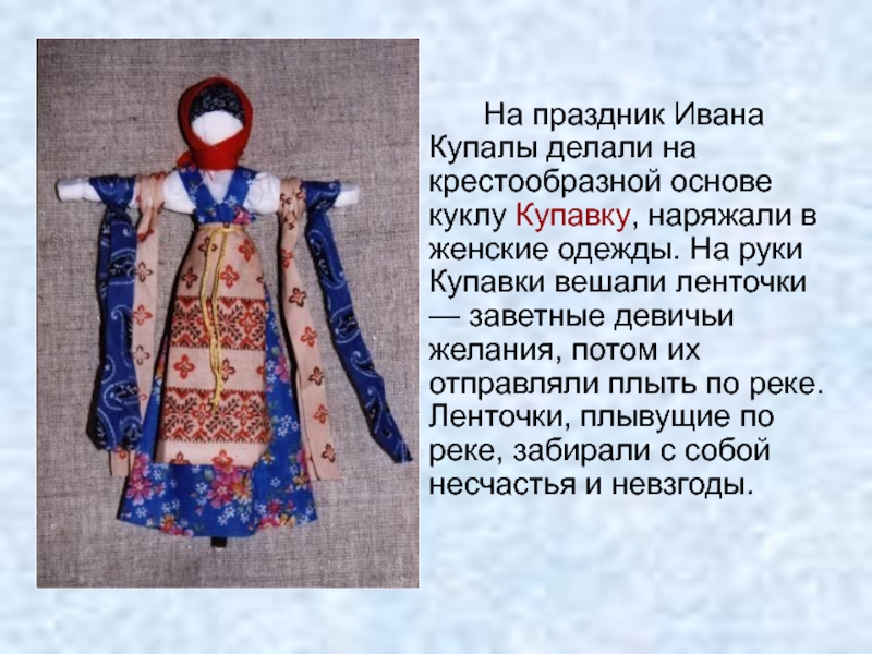 Слайд 15 На праздник Ивана Купалы делали на крестообразной основе куклу Купавку, наряжали