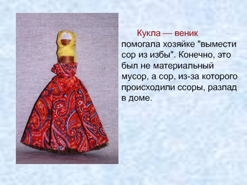 Слайд 8 Кукла — веник помогала хозяйке "вымести сор из избы". Конечно, это