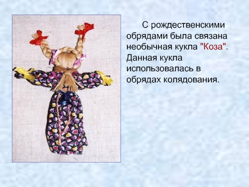 Слайд 12 С рождественскими обрядами была связана необычная кукла "Коза". Данная кукла использовалась