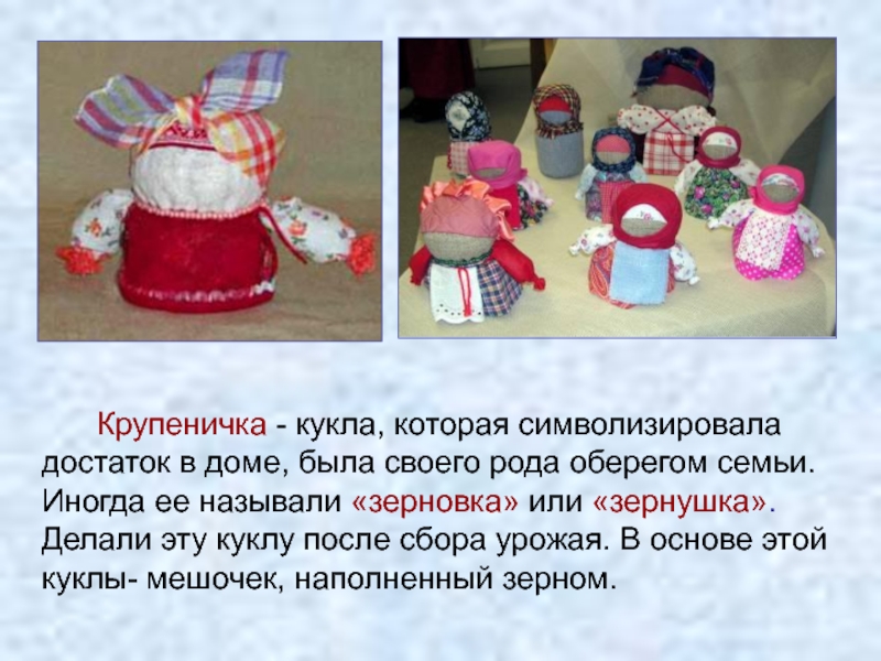Слайд 7 Крупеничка - кукла, которая символизировала достаток в доме, была своего рода