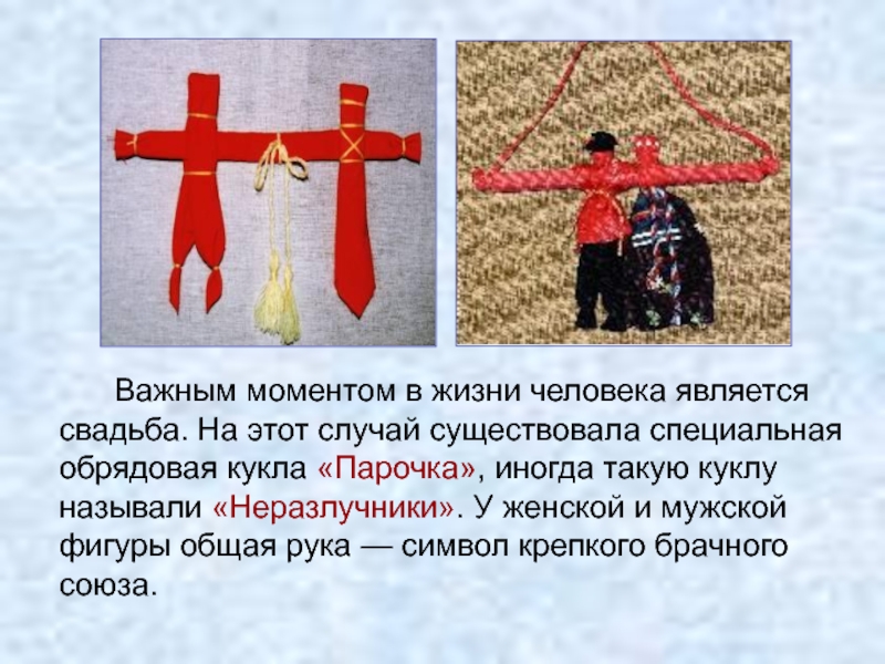 специальная обрядовая кукла «Парочка», иногда такую куклу называли «Неразлучники». У женской и мужской фигуры общая рука — символ крепкого брачного союза.