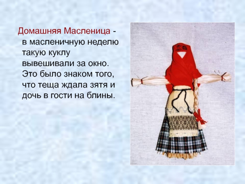 Слайд 14 Домашняя Масленица - в масленичную неделю такую куклу вывешивали за