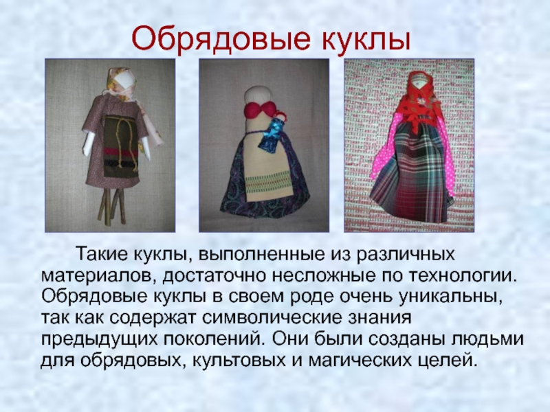 Обрядовые куклы		Такие куклы, выполненные из различных материалов, достаточно несложные по технологии. Обрядовые куклы в своем роде очень