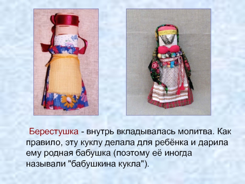 Слайд 5 Берестушка - внутрь вкладывалась молитва. Как правило, эту куклу делала для
