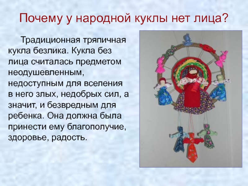 Почему у народной куклы нет лица? Традиционная тряпичная кукла безлика. Кукла без лица считалась предметом неодушевленным, недоступным для вселения в него злых, недобрых сил, а значит, и безвредным для ребенка. Она должна была принести ему благополучие, здоровье,