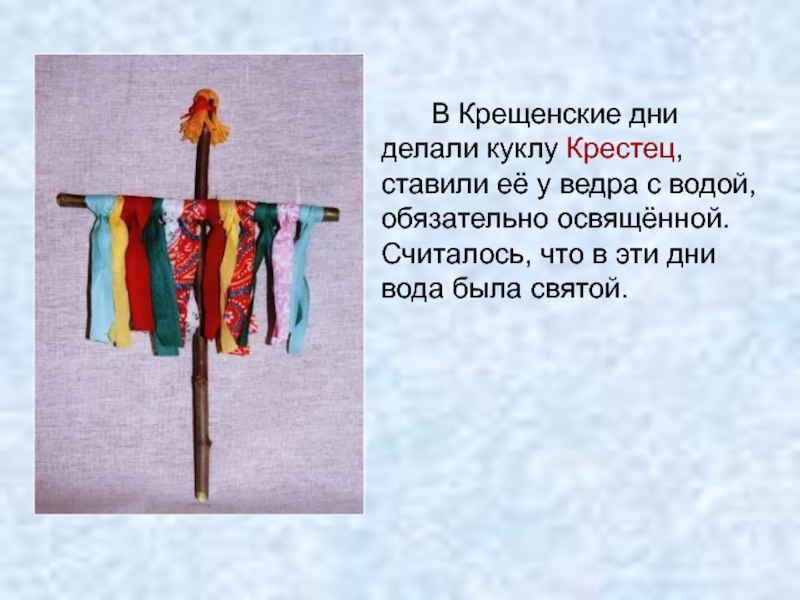 Слайд 13 В Крещенские дни делали куклу Крестец, ставили её у ведра с