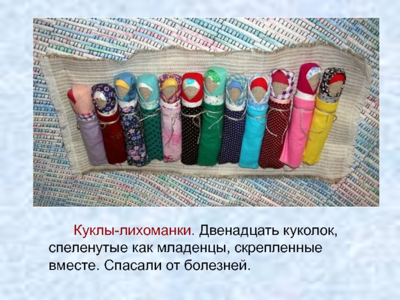 Слайд 10 Куклы-лихоманки. Двенадцать куколок, спеленутые как младенцы, скрепленные вместе. Спасали от болезней.