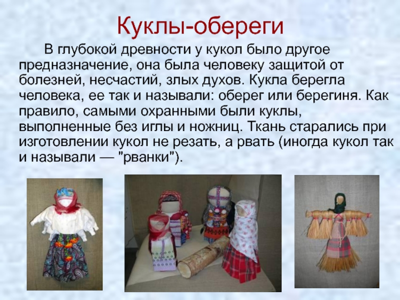 защитой от болезней, несчастий, злых духов. Кукла берегла человека, ее так и называли: оберег или берегиня. Как правило, самыми охранными были куклы, выполненные без иглы и ножниц. Ткань старались при изготовлении кукол не резать, а рвать (иногда кукол так и называли — "рванки").