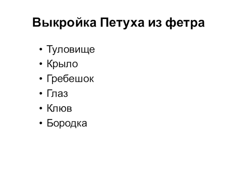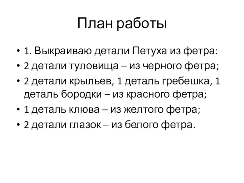 План работы1. Выкраиваю детали Петуха из фетра:2 детали туловища – из черного фетра;2 детали крыльев, 1 деталь
