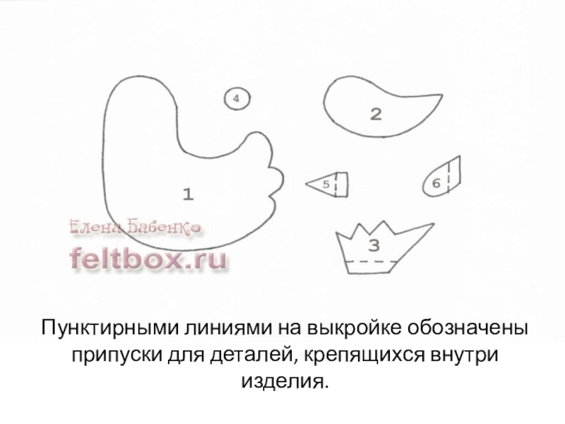 Слайд 6Пунктирными линиями на выкройке обозначены припуски для деталей, крепящихся внутри изделия.