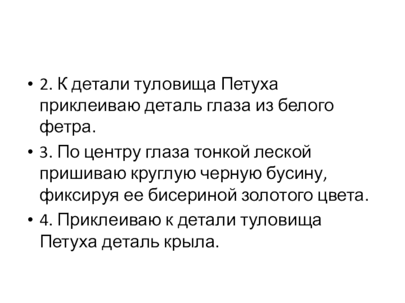 Слайд 82. К детали туловища Петуха приклеиваю деталь глаза из белого фетра.