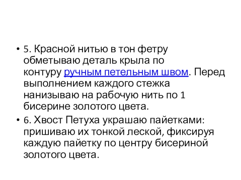 Слайд 95. Красной нитью в тон фетру обметываю деталь крыла по контуру ручным