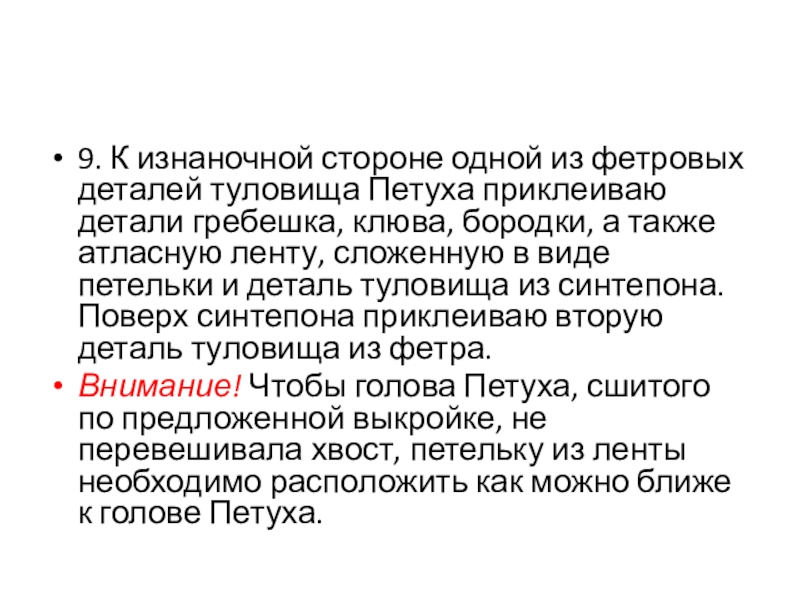 Слайд 119. К изнаночной стороне одной из фетровых деталей туловища Петуха приклеиваю