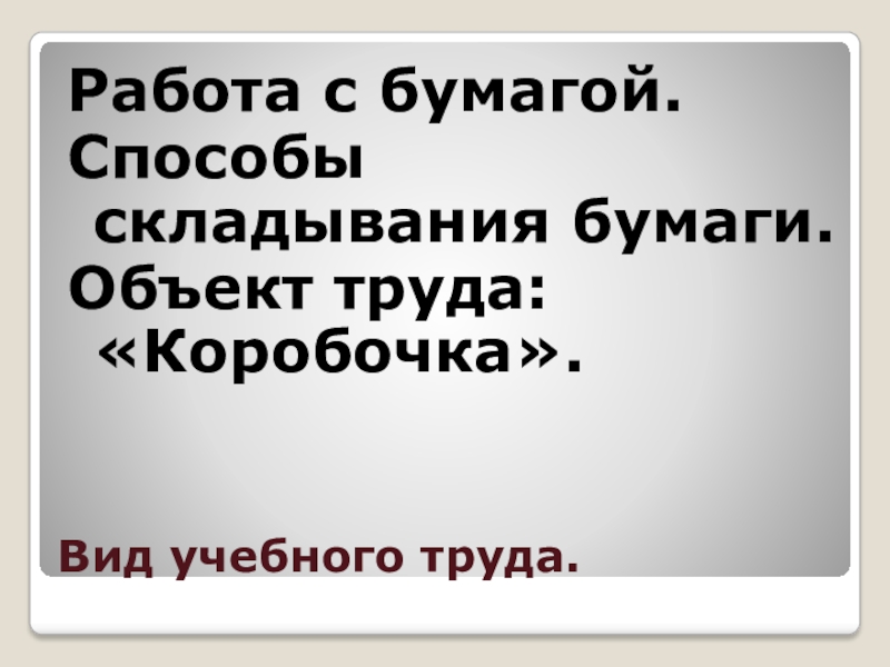 Вид учебного труда.Работа с бумагой.Способы складывания бумаги.Объект труда: «Коробочка».