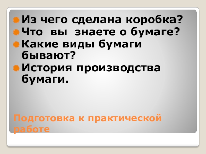 Подготовка к практической работеИз чего сделана коробка?Что вы знаете о бумаге?Какие виды бумаги бывают?История производства бумаги.