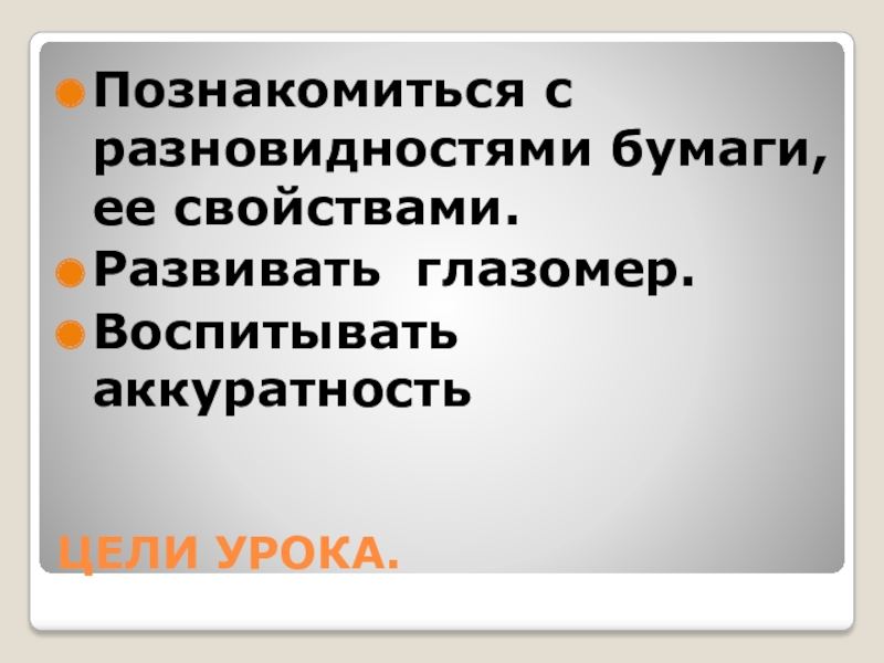 ЦЕЛИ УРОКА.Познакомиться с разновидностями бумаги, ее свойствами.Развивать глазомер.Воспитывать аккуратность