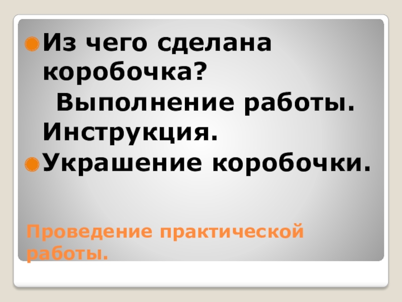 Проведение практической работы.Из чего сделана коробочка?  Выполнение работы. Инструкция.Украшение коробочки.