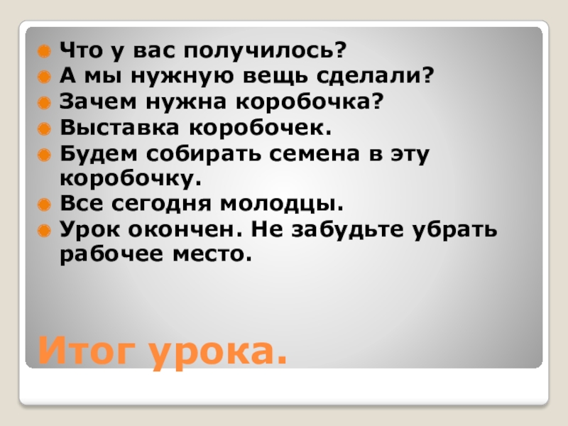 Итог урока.Что у вас получилось?А мы нужную вещь сделали?Зачем нужна коробочка?Выставка коробочек.Будем собирать семена в эту коробочку.Все