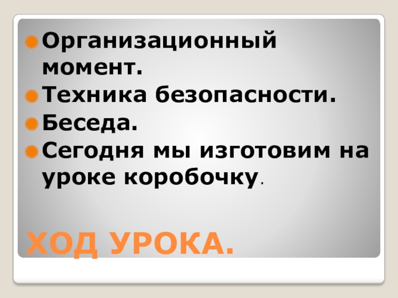 ХОД УРОКА.Организационный момент.Техника безопасности.Беседа.Сегодня мы изготовим на уроке коробочку.