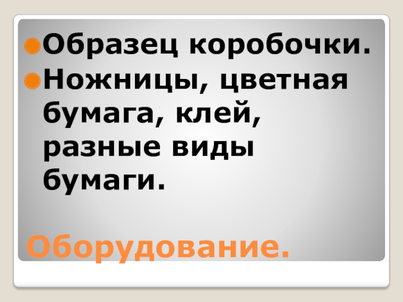 Оборудование.Образец коробочки.Ножницы, цветная бумага, клей, разные виды бумаги.