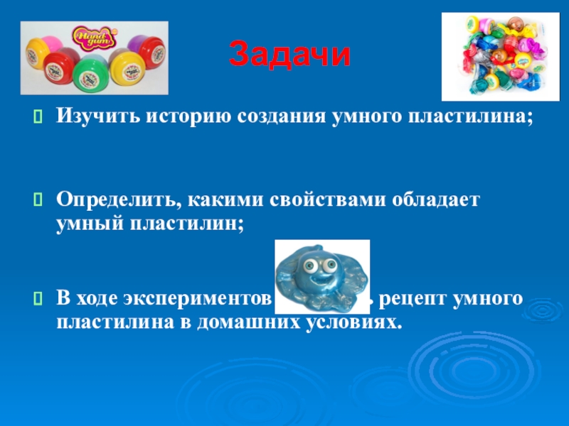 ЗадачиИзучить историю создания умного пластилина;Определить, какими свойствами обладает умный пластилин;В ходе экспериментов получить рецепт умного пластилина в