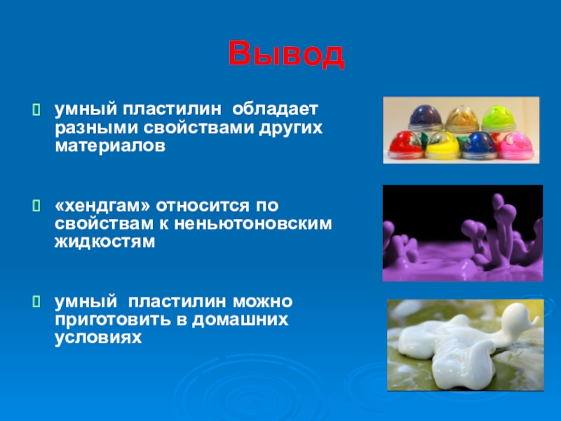 Выводумный пластилин обладает разными свойствами других материалов «хендгам» относится по свойствам к неньютоновским жидкостямумный пластилин можно приготовить