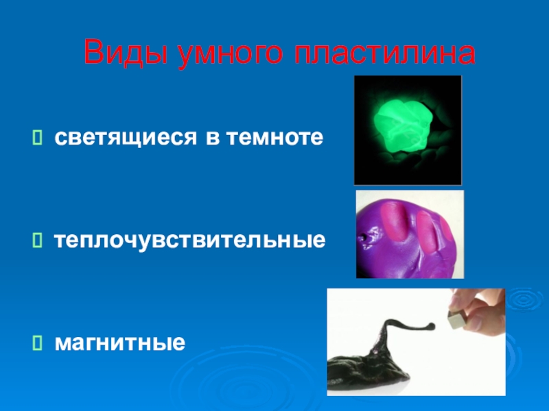 Виды умного пластилинасветящиеся в темнотетеплочувствительныемагнитные