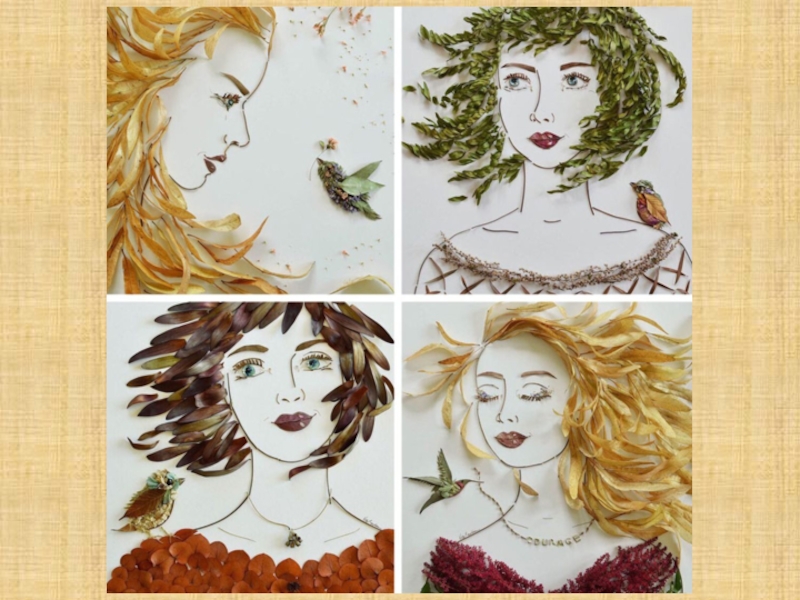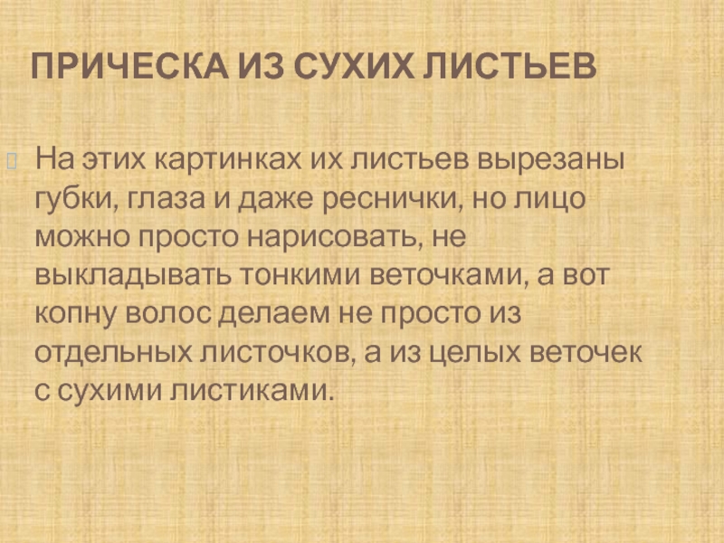 Прическа из сухих листьевНа этих картинках их листьев вырезаны губки, глаза и даже реснички, но лицо можно