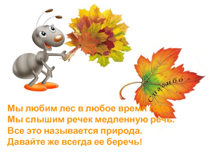 Мы любим лес в любое время годаМы слышим речек медленную речь.Все это называется природа.Давайте же всегда ее