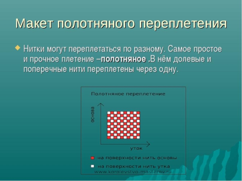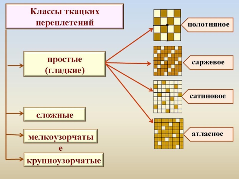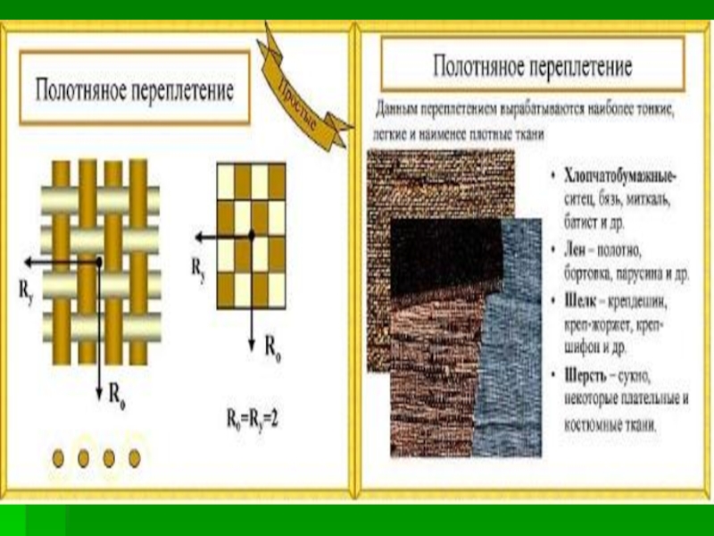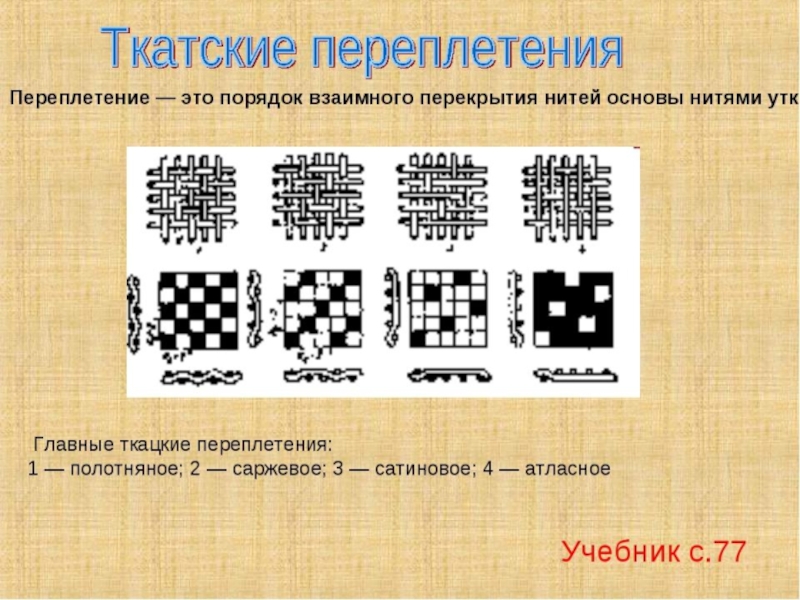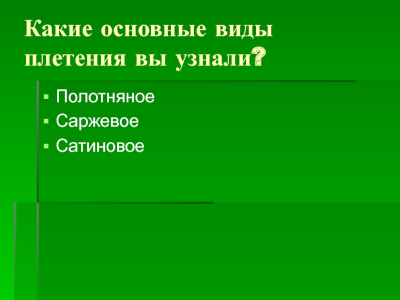 Какие основные виды плетения вы узнали?ПолотняноеСаржевоеСатиновое