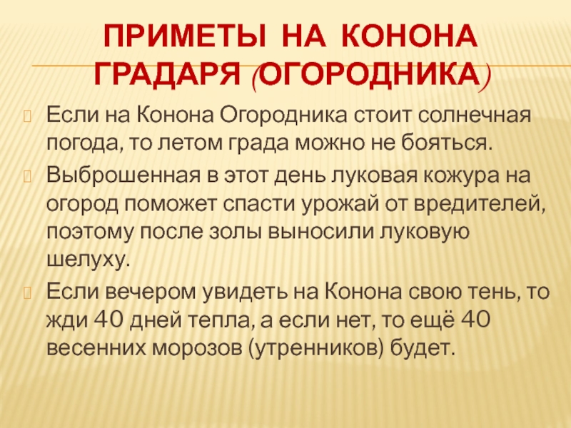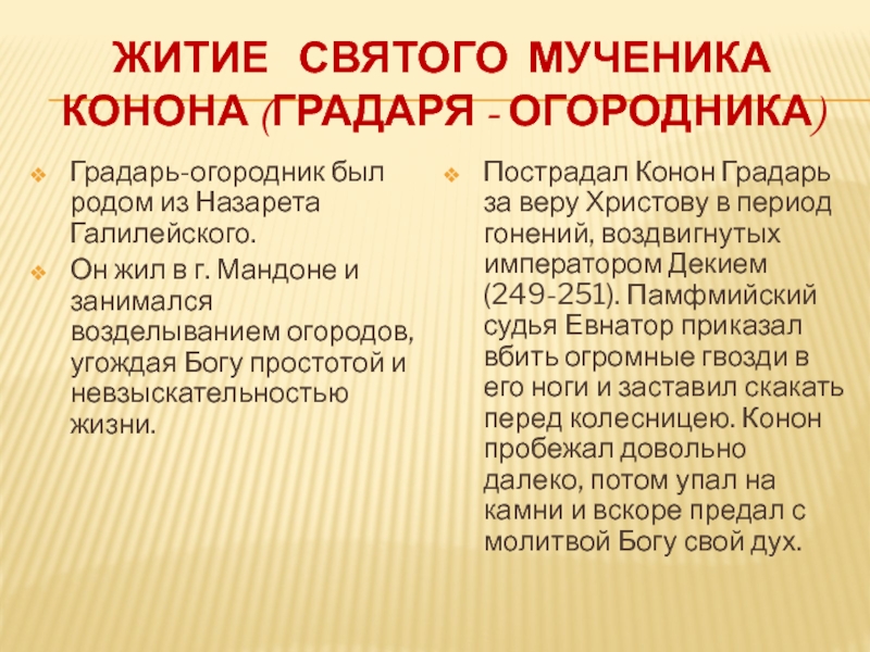 Пострадал Конон Градарь за веру Христову в период гонений, воздвигнутых императором Декием (249-251). Памфмийский судья Евнатор приказал вбить огромные гвозди в его ноги и заставил скакать перед колесницею. Конон пробежал довольно далеко, потом упал на камни и вскоре предал с молитвой Богу свой дух.