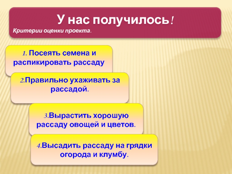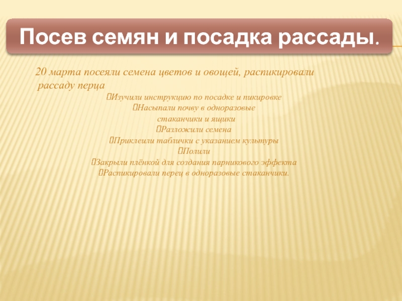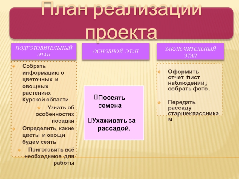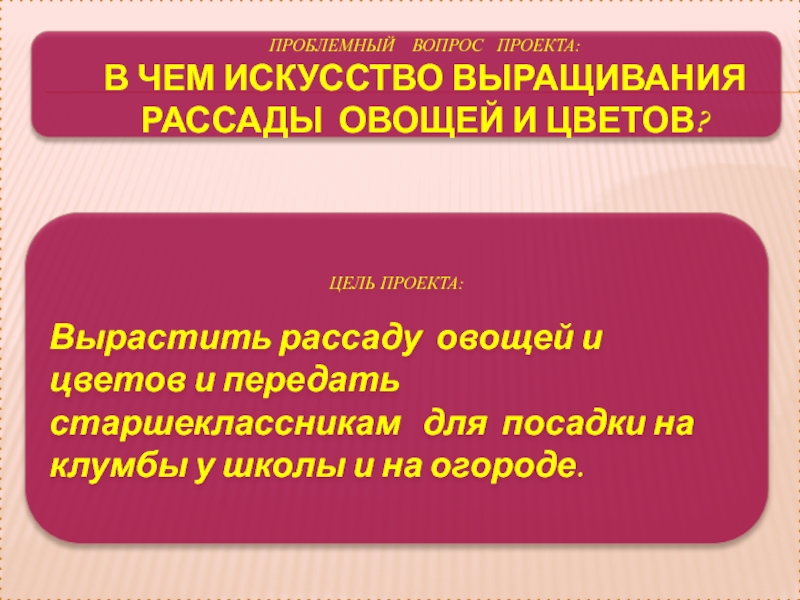 Вырастить рассаду овощей и цветов и передать старшеклассникам для посадки на клумбы у школы и на огороде.