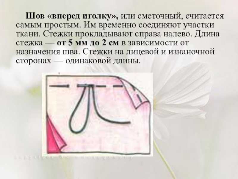 Слайд 18 Шов «вперед иголку», или сметочный, считается самым