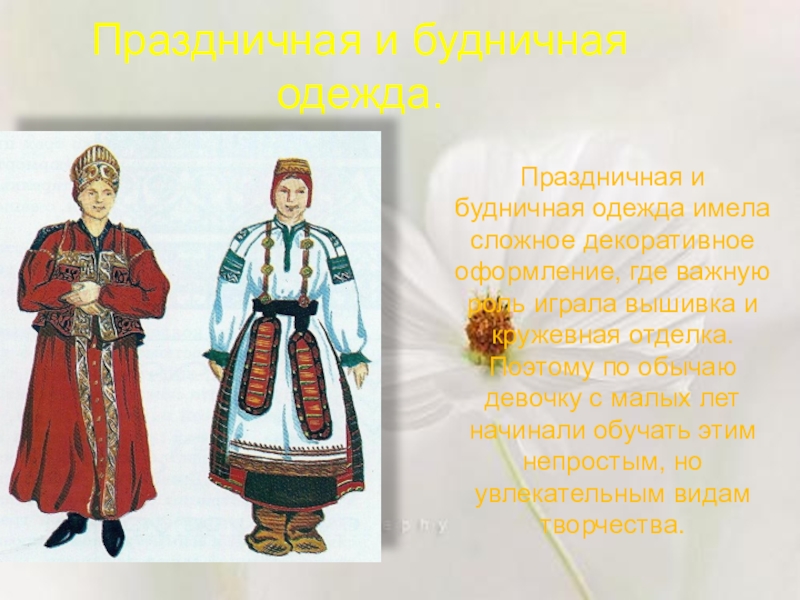 Праздничная и будничная одежда имела сложное декоративное оформление,