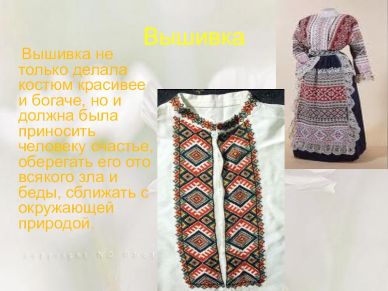 Вышивка  Вышивка не только делала костюм красивее и богаче, но и должна была приносить человеку счастье,