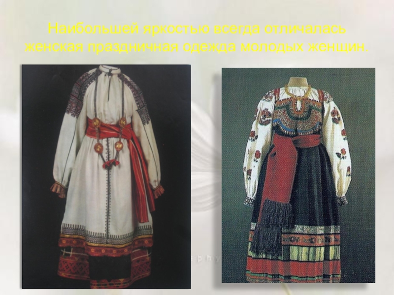 Слайд 11Наибольшей яркостью всегда отличалась женская праздничная одежда молодых женщин.