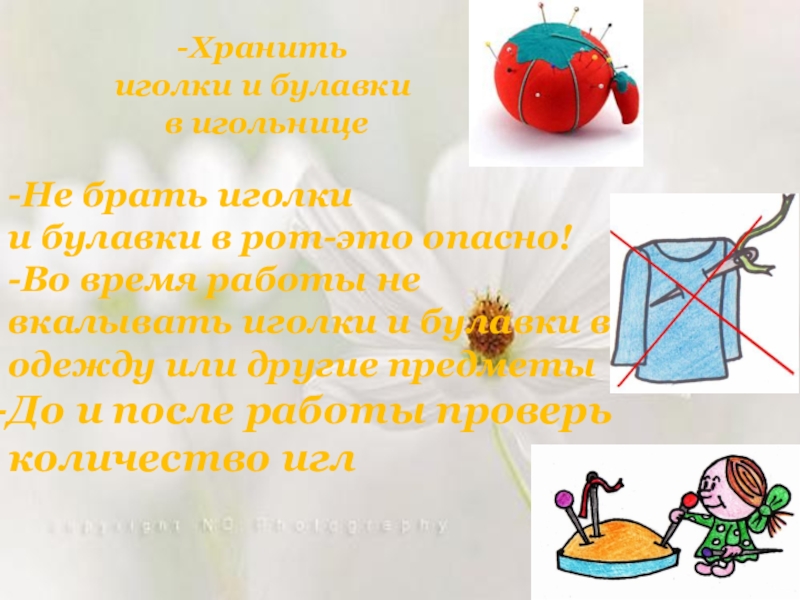 -Хранить иголки и булавки в игольнице-Не брать иголки и булавки в рот-это опасно!-Во время работы не вкалывать