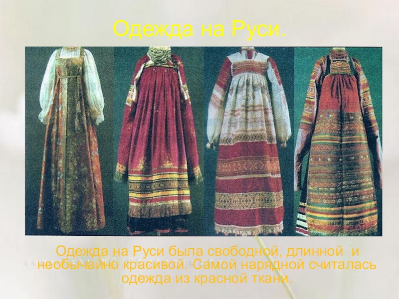 Одежда на Руси.  Одежда на Руси была свободной, длинной и необычайно красивой. Самой нарядной считалась одежда