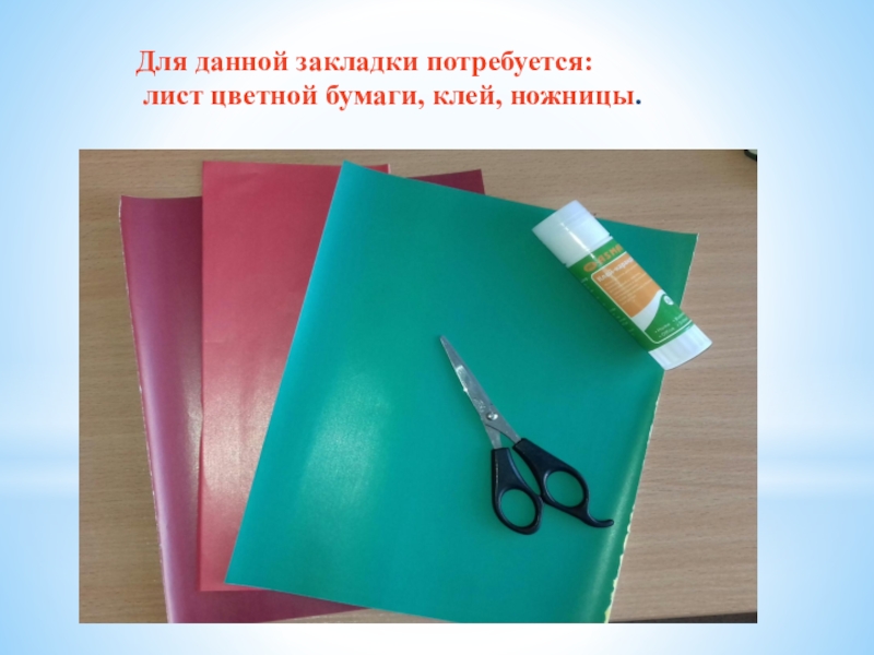 Слайд 2Для данной закладки потребуется: лист цветной бумаги, клей, ножницы.