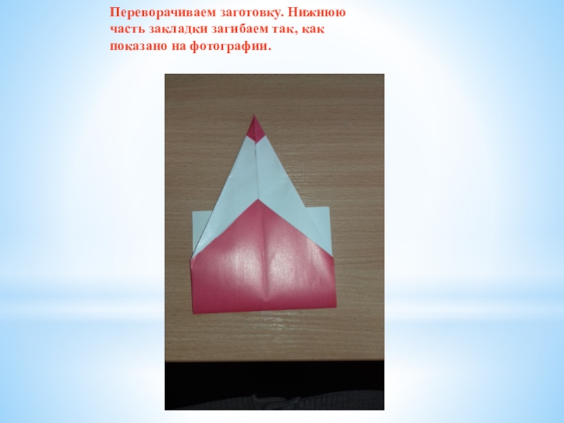 Слайд 7Переворачиваем заготовку. Нижнюю часть закладки загибаем так, как показано на фотографии.