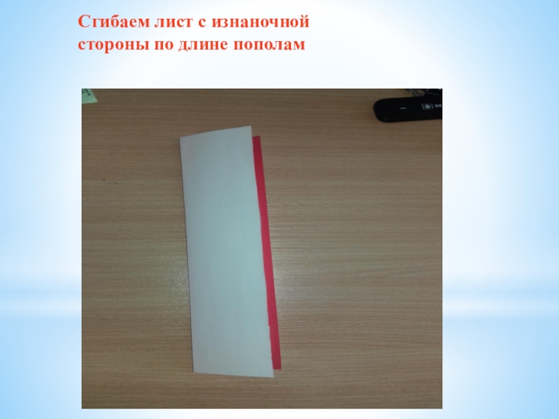 Слайд 3Сгибаем лист с изнаночной стороны по длине пополам