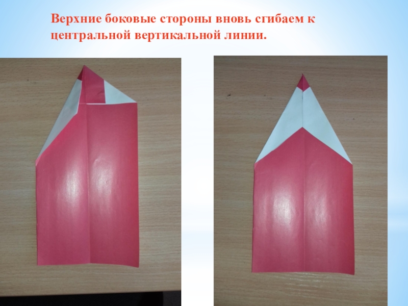 Слайд 6Верхние боковые стороны вновь сгибаем к центральной вертикальной линии.