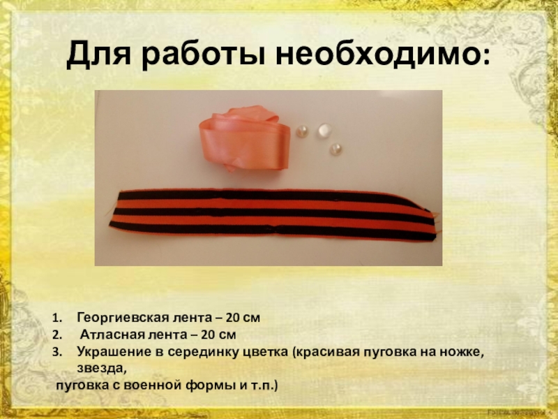 Для работы необходимо:Георгиевская лента – 20 см Атласная лента – 20 смУкрашение в серединку цветка (красивая пуговка на ножке, звезда, пуговка с военной формы и т.п.)