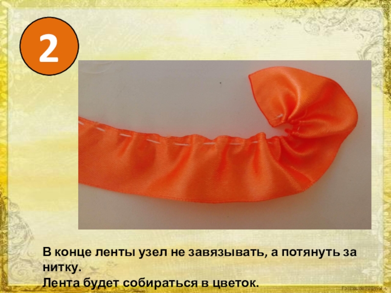 2В конце ленты узел не завязывать, а потянуть за нитку. Лента будет собираться в цветок.