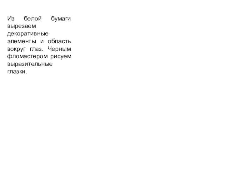 Слайд 9Из белой бумаги вырезаем декоративные элементы и область вокруг глаз. Черным