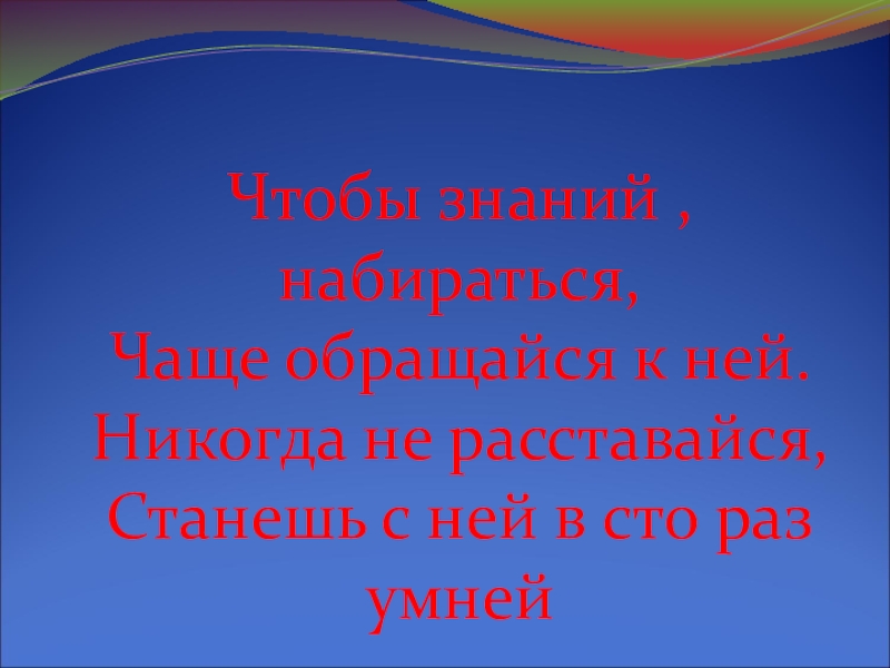 Чтобы знаний ,набираться, Чаще обращайся к ней. Никогда не расставайся, Станешь с ней в сто раз умней