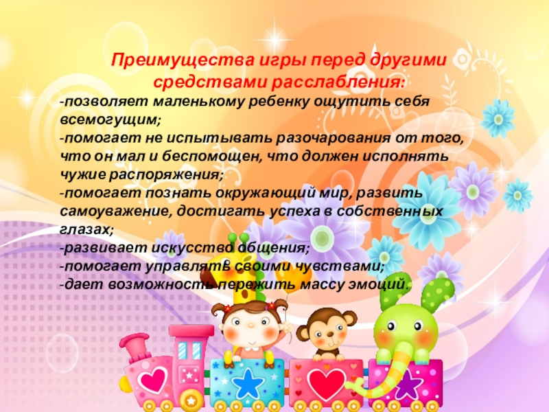 Слайд 11Преимущества игры перед другими средствами расслабления: