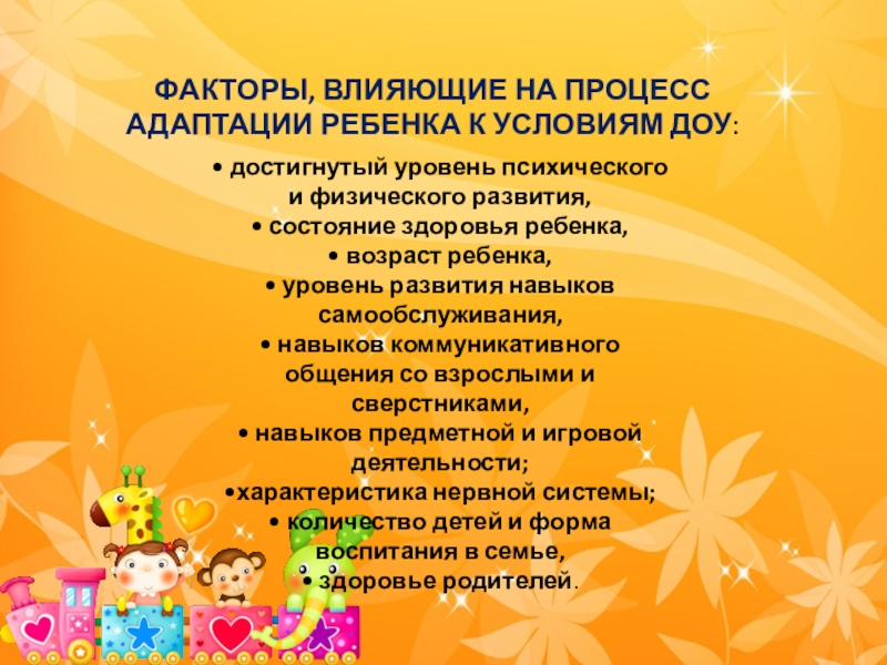 Слайд 3ФАКТОРЫ, ВЛИЯЮЩИЕ НА ПРОЦЕСС АДАПТАЦИИ РЕБЕНКА К УСЛОВИЯМ ДОУ: