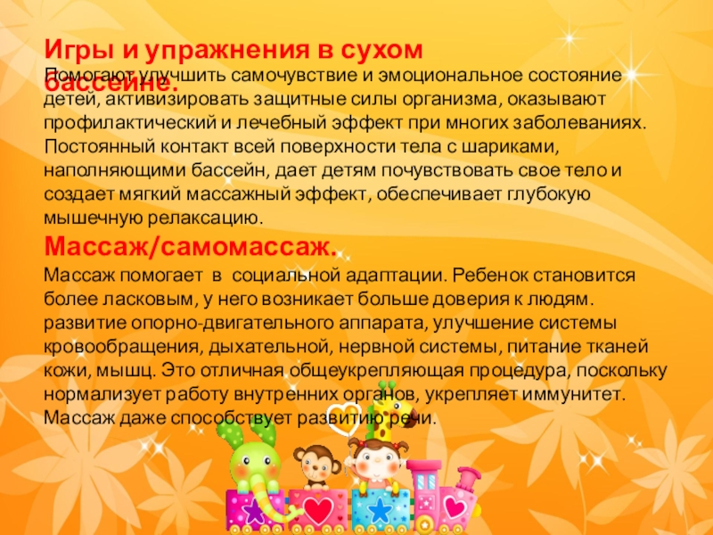 детей, активизировать защитные силы организма, оказывают профилактический и лечебный эффект при многих заболеваниях. Постоянный контакт всей поверхности тела с шариками, наполняющими бассейн, дает детям почувствовать свое тело и создает мягкий массажный эффект, обеспечивает глубокую мышечную релаксацию.