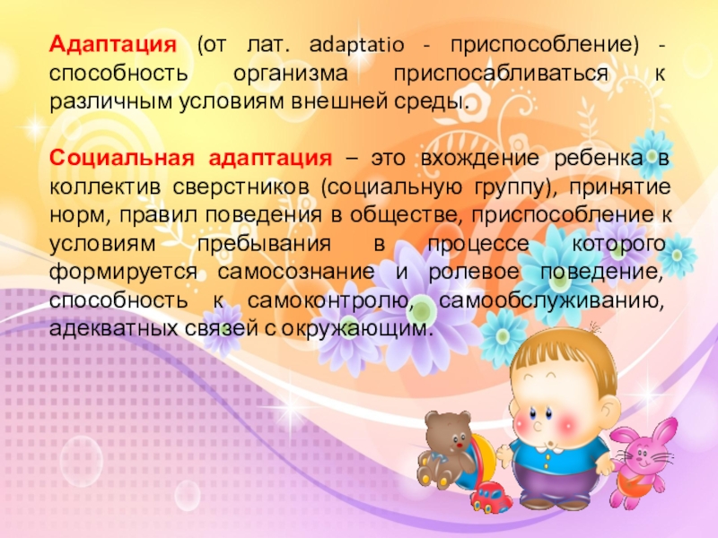 Социальная адаптация – это вхождение ребенка в коллектив сверстников (социальную группу), принятие норм, правил поведения в обществе, приспособление к условиям пребывания в процессе которого формируется самосознание и ролевое поведение, способность к самоконтролю, самообслуживанию, адекватных связей с окружающим.